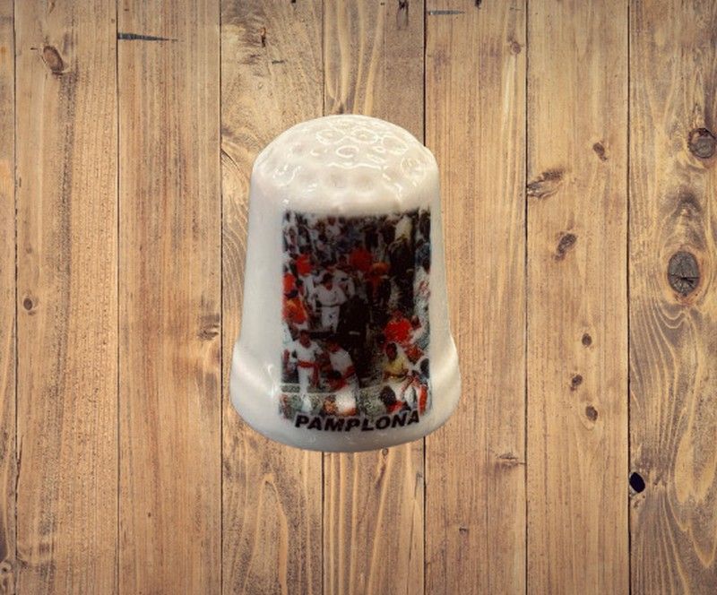 Dedal cerámico con imagen del encierro en plena acción y el nombre "Pamplona" en la base. Un recuerdo auténtico y clásico de los Sanfermines.