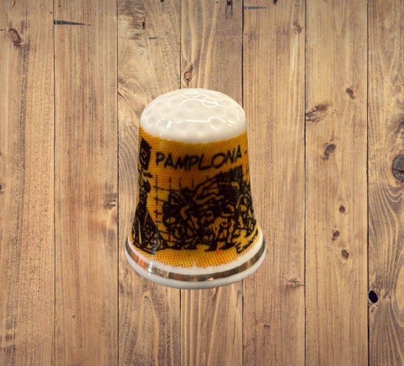 Dedal de colección con diseño del encierro y el nombre "Pamplona" sobre fondo amarillo. Un recuerdo clásico y lleno de tradición sanferminera.