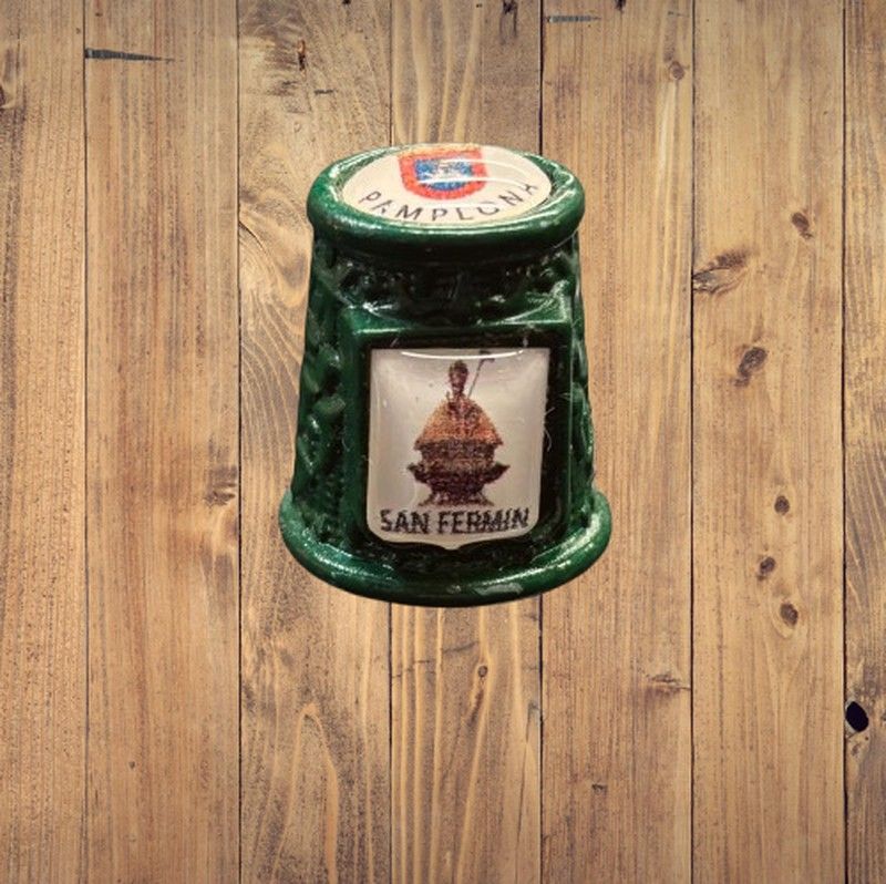 Dedal decorativo en color verde con relieve y medallón de San Fermín, junto al nombre "Pamplona" en la parte superior. Un recuerdo elegante y tradicional de las fiestas.