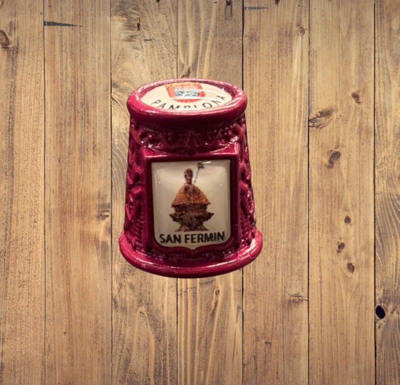 Dedal decorativo en tono burdeos con relieve y medallón de San Fermín, acompañado del nombre "Pamplona" en la parte superior. Un recuerdo elegante y tradicional de las fiestas.