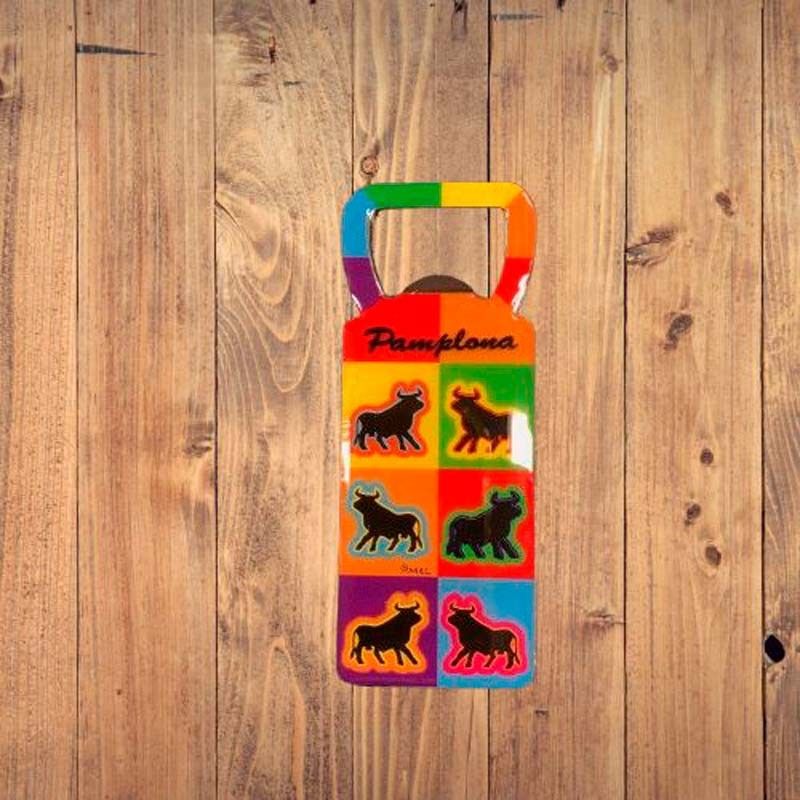 Abridor de botellas con diseño colorido y siluetas de toros, acompañado del nombre "Pamplona". Un accesorio llamativo y práctico, ideal como recuerdo moderno de la ciudad 8cmx3cm.