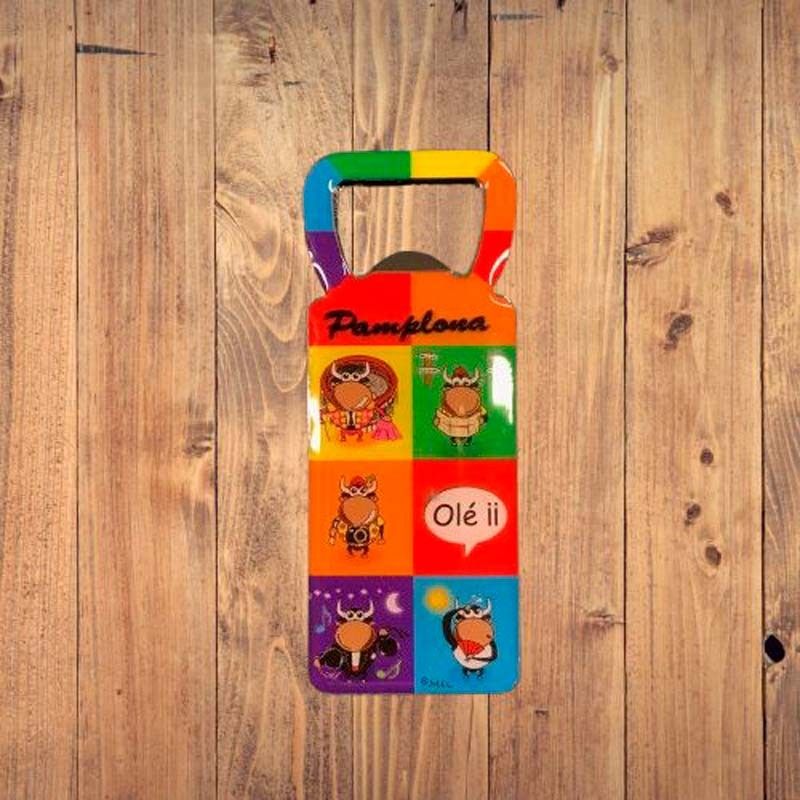 Abridor de botellas con diseño colorido, protagonizado por toros caricaturizados y el texto "Olé!!". Un recuerdo divertido y vibrante de Pamplona 8cmx3cm.