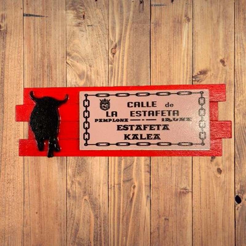 Imán estilo rústico con diseño de la placa de la Calle Estafeta (Estafeta Kalea) y silueta de toro en relieve. 3.5cmx11cm.