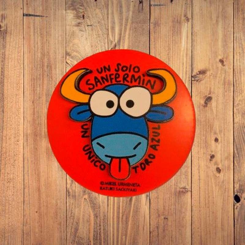 Imán redondo con el divertido "toro azul" y la frase "Un solo San Fermín, un único toro azul". Un diseño simpático y moderno que aporta un toque original a cualquier colección7cm.