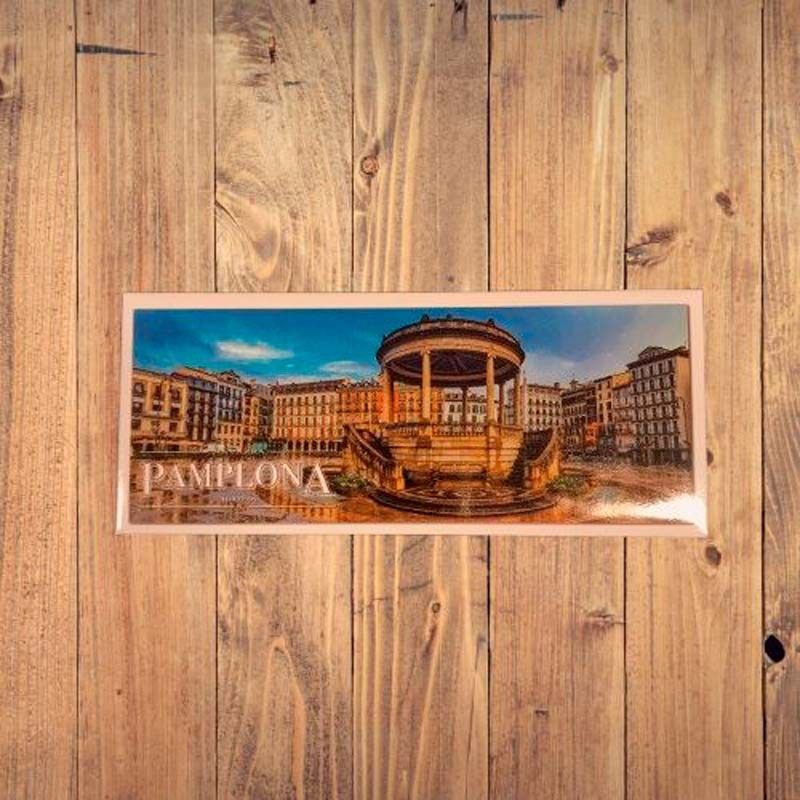 Imán panorámico con una vista espectacular del quiosco de la Plaza del Castillo en Pamplona. Un recuerdo elegante que captura el corazón de la ciudad 5cmx12cm.