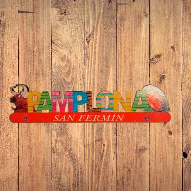 Imán colorido con el texto "Pamplona - San Fermín", decorado con un toro y una figura tradicional. Un recuerdo alegre y festivo ideal para coleccionar o regalar 3cmx12cm.