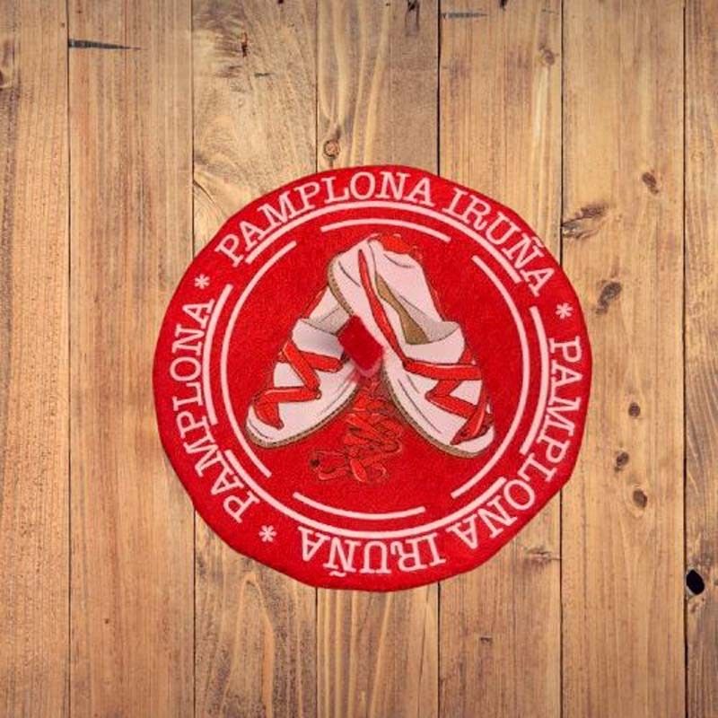 Txapela roja con estampado de unas alpargatas y "Pamplona iruña". Un recuerdo muy tipico de Pamplona 7cm.