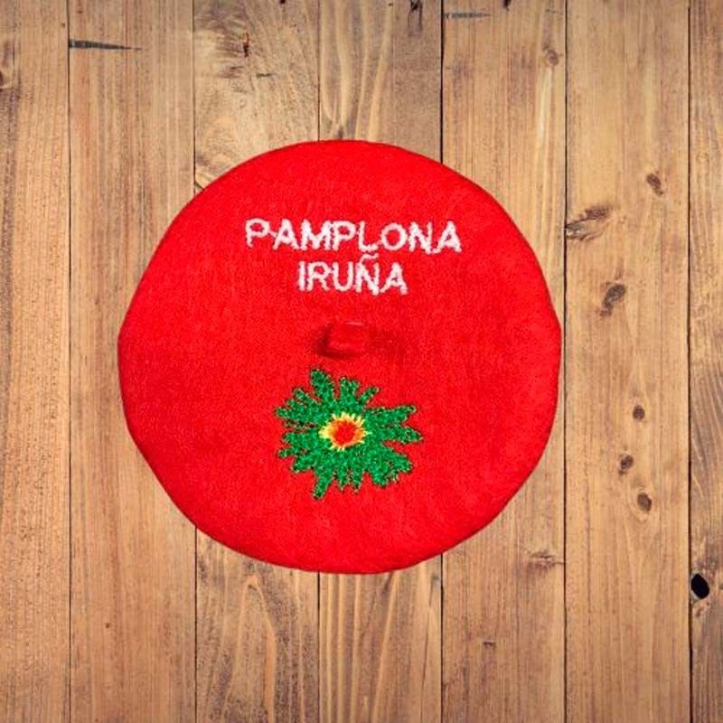 Txapela roja con bordado "Pamplona - Iruña", acompañada de un eguzkilore. Un recuerdo muy tipico de Pamplona 7cm.