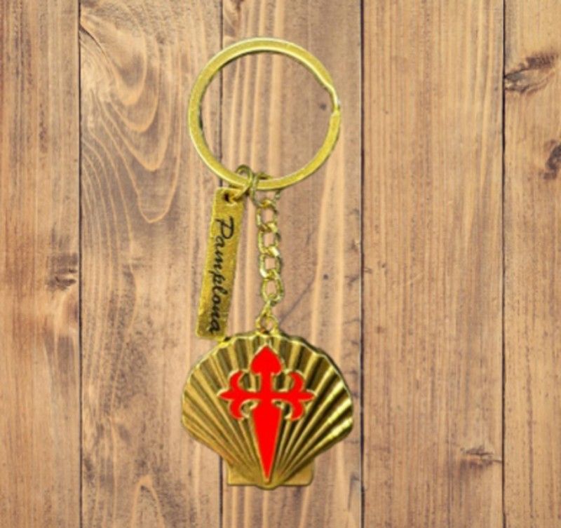 Llavero metálico con vieira dorada y Cruz de Santiago en rojo. Elegante, resistente y perfecto como recuerdo del Camino desde Pamplona.