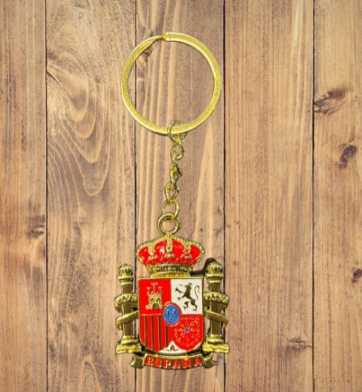 Llavero metálico con el escudo de España en acabado dorado. Detallado, resistente y perfecto como recuerdo o para llevar en el día a día.