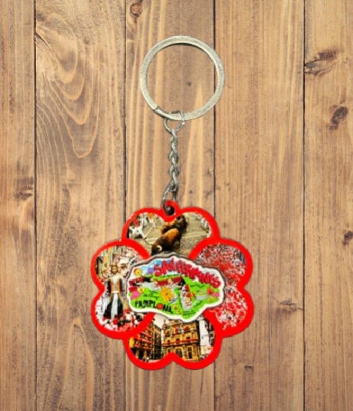 Llavero con forma de flor y collage de escenas típicas de San Fermín. Colorido, festivo y perfecto como recuerdo de Pamplona.