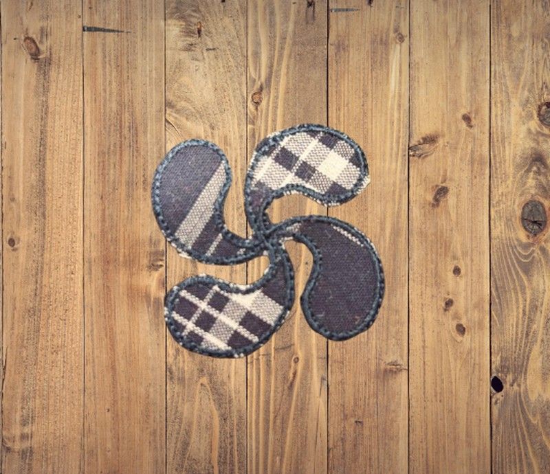 Parche textil con diseño de lauburu en patrón de cuadros y tonos oscuros. Un símbolo vasco reinterpretado con estilo moderno para personalizar prendas y accesorios.