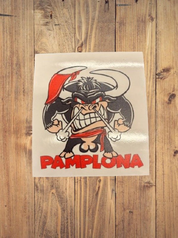 Pegatina con un toro caricaturizado y enfadado, vestido de sanferminero y acompañada del texto "Pamplona". Un diseño divertido y llamativo ideal para personalizar cascos, cuadernos o accesorios.