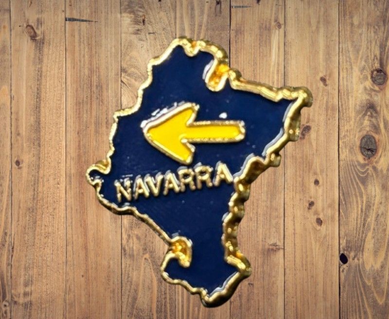 Pin metálico con la silueta de Navarra en color azul, decorado con una flecha amarilla del Camino de Santiago y borde dorado. Acabado esmaltado y diseño llamativo.
